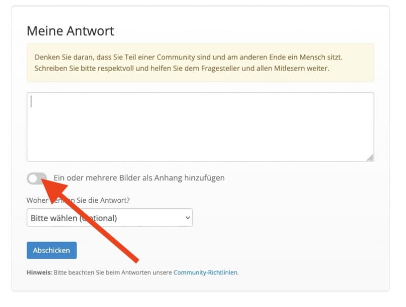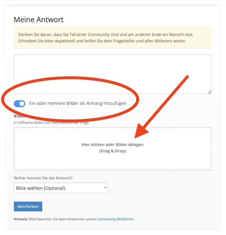 Du gehst einfach auf "Frage beantworten" bzw. in ein neues Antwortfeld und aktivierst den Schalter "Ein oder mehrere Bilder als Anhang hinzufügen"