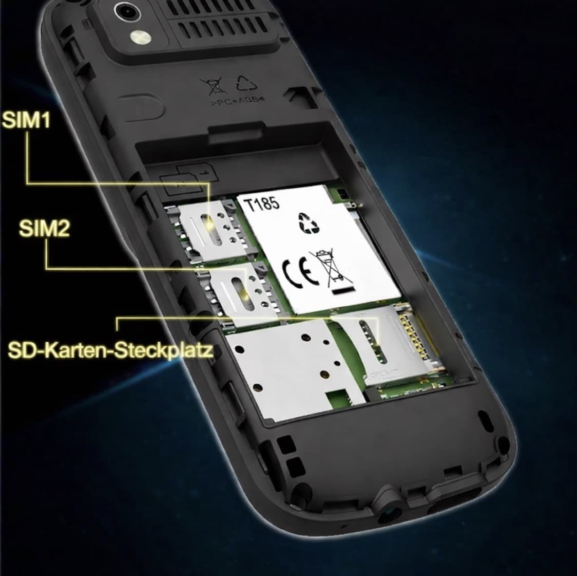 Öffne zuerst die rückseitige Abdeckung des Telefons und entnimm den Akku. Unter dem Akku siehst du die Steckplätze **SIM1, SIM2** sowie den **SD-Karten-Steckplatz**.